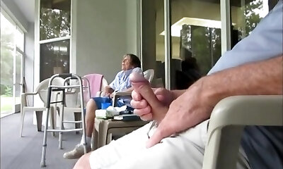 dickflash in a hotel where a maid comes thru the balcony and gets jism on her tits