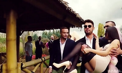 Gangbang for a hot brunette thirsty for sex and hot jism in a