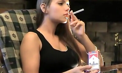 Hottest brunette Cougar with huge bra-stuffers smoking and posing in front of the webcam